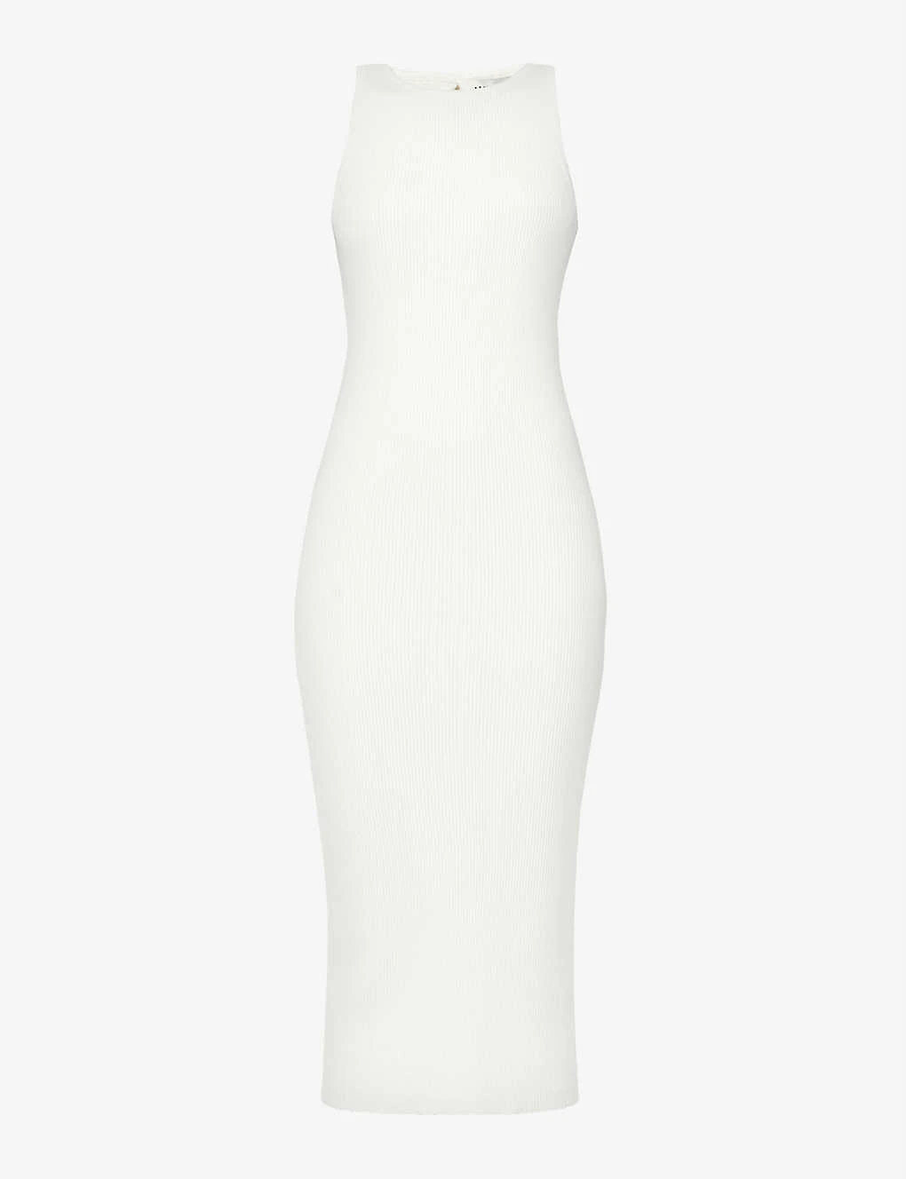 - Round neck, sleeveless, fitted, all-over ribbed texture, cut-out at back, straight hem