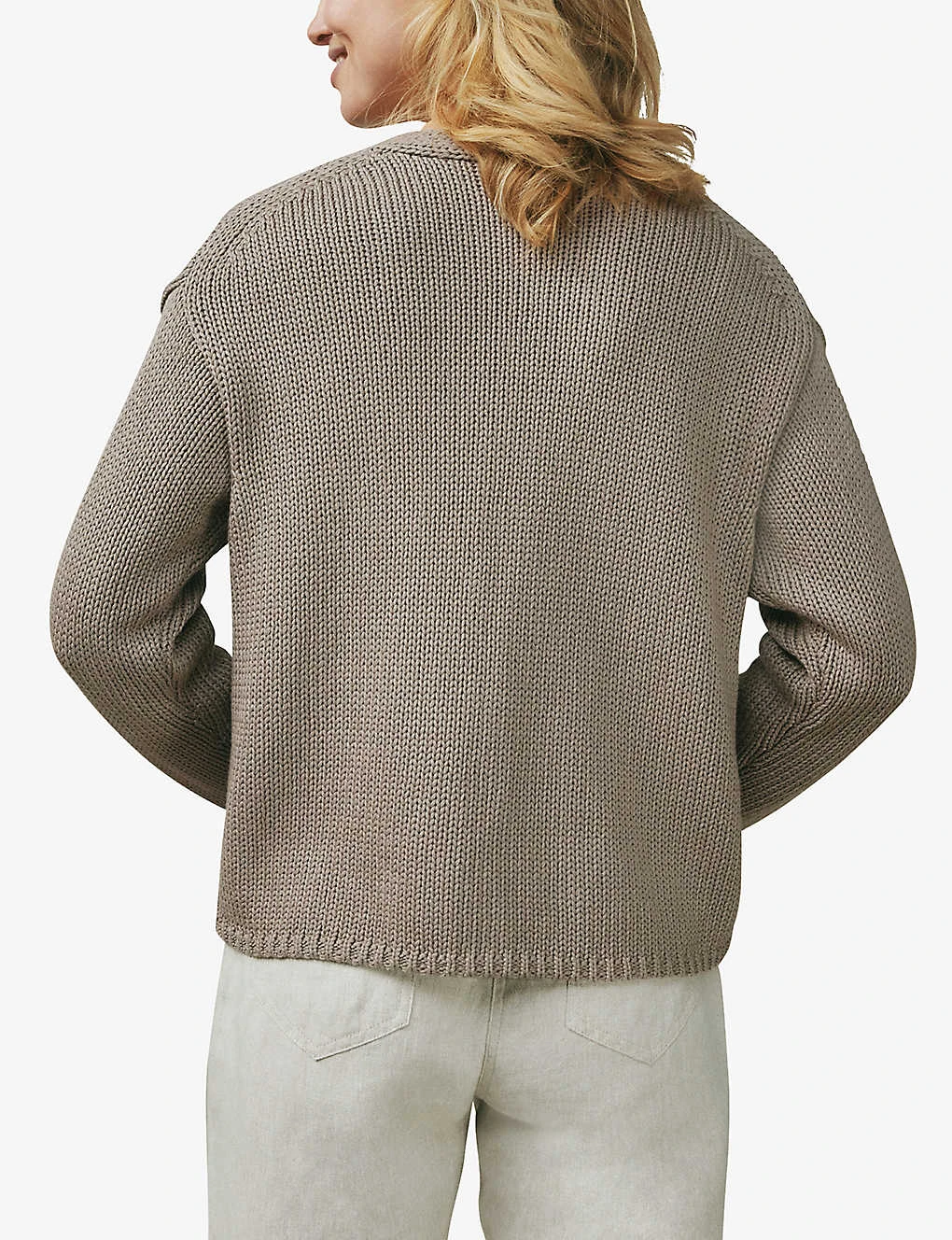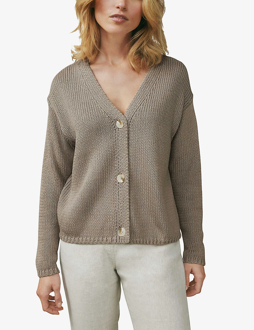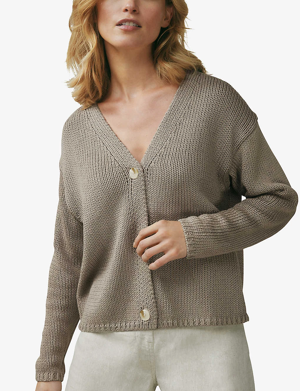 - Relaxed fit, long sleeves, V neck, dropped shoulders, knitted construction, ribbed trims, contrasting mock-horn buttons, straight hem
