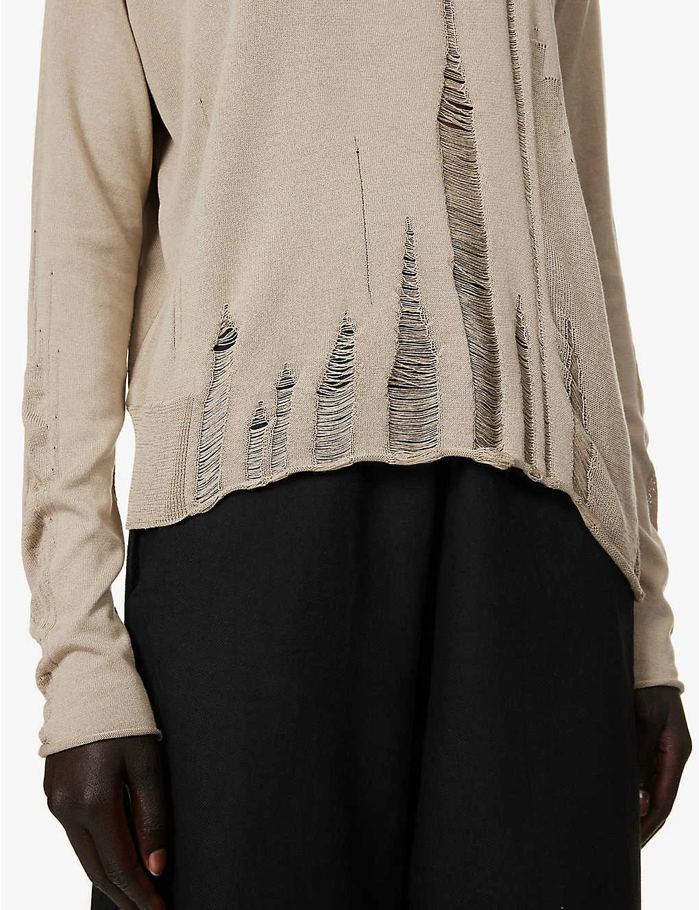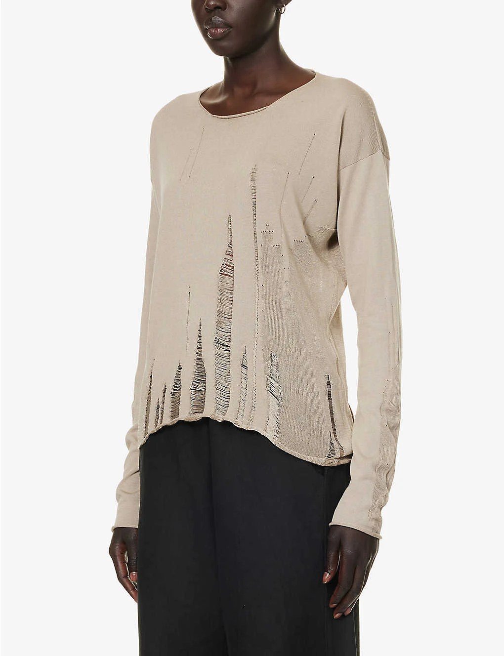 - Relaxed fit, round neck, long sleeves, distressed patches, fine knit texture, rolled raw trims