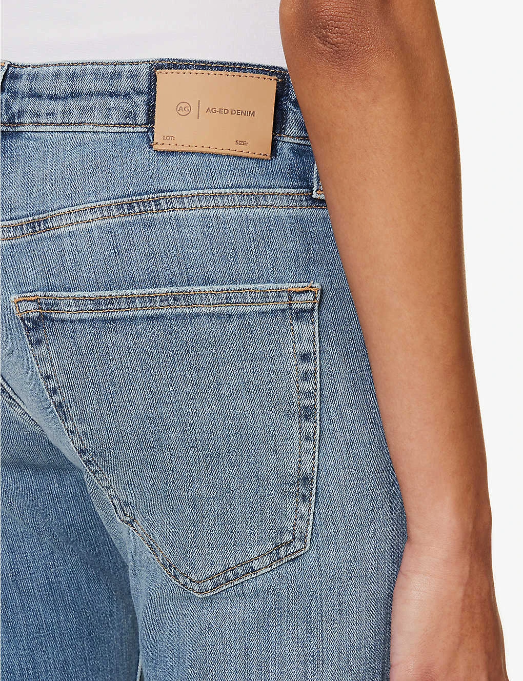 - Slim fit, mid-rise, tapered leg, structured waistband with belt loops, five pockets, folded hems, curved yoke at back, brand patch at back, mid-faded wash, contrast stitching, branded hardware