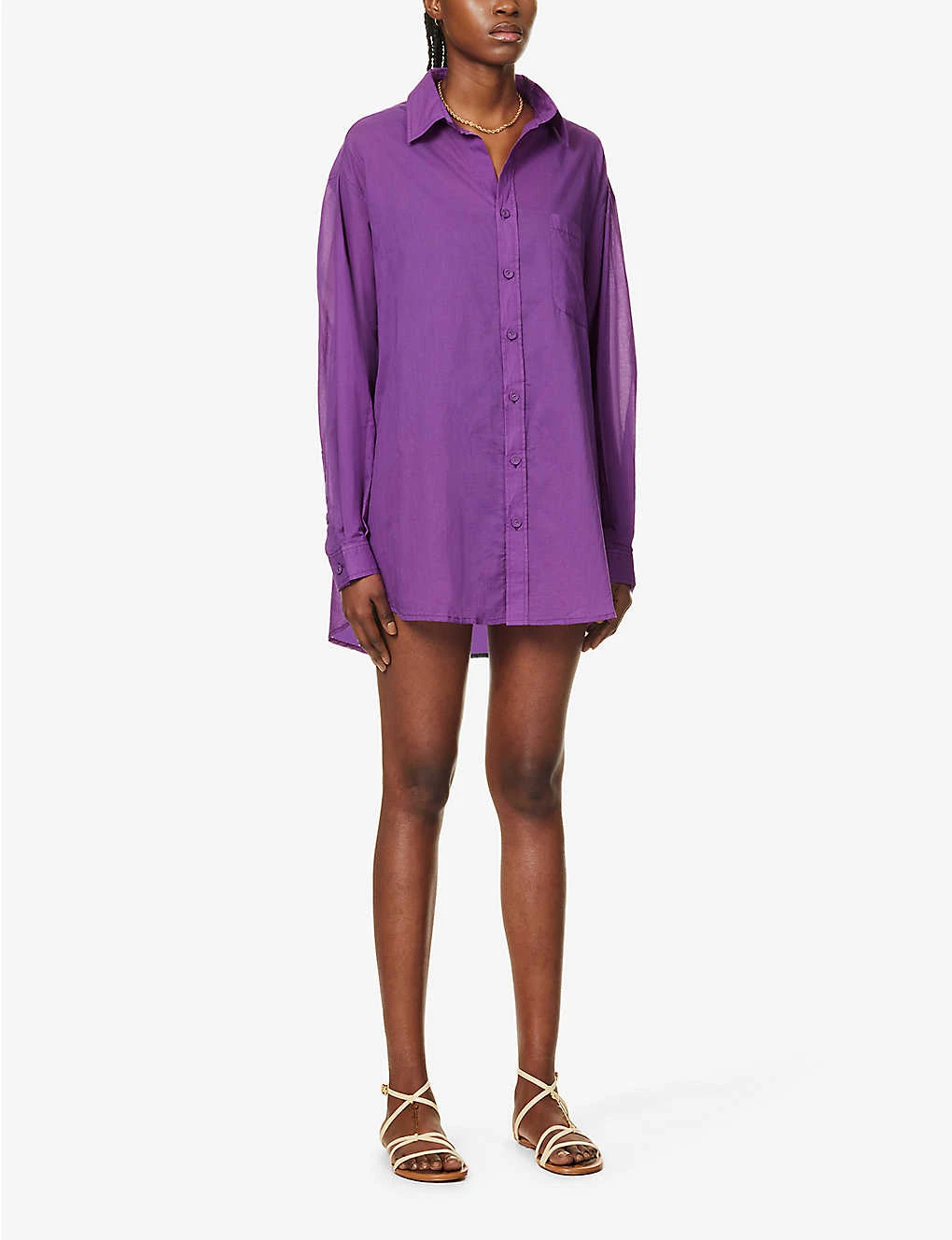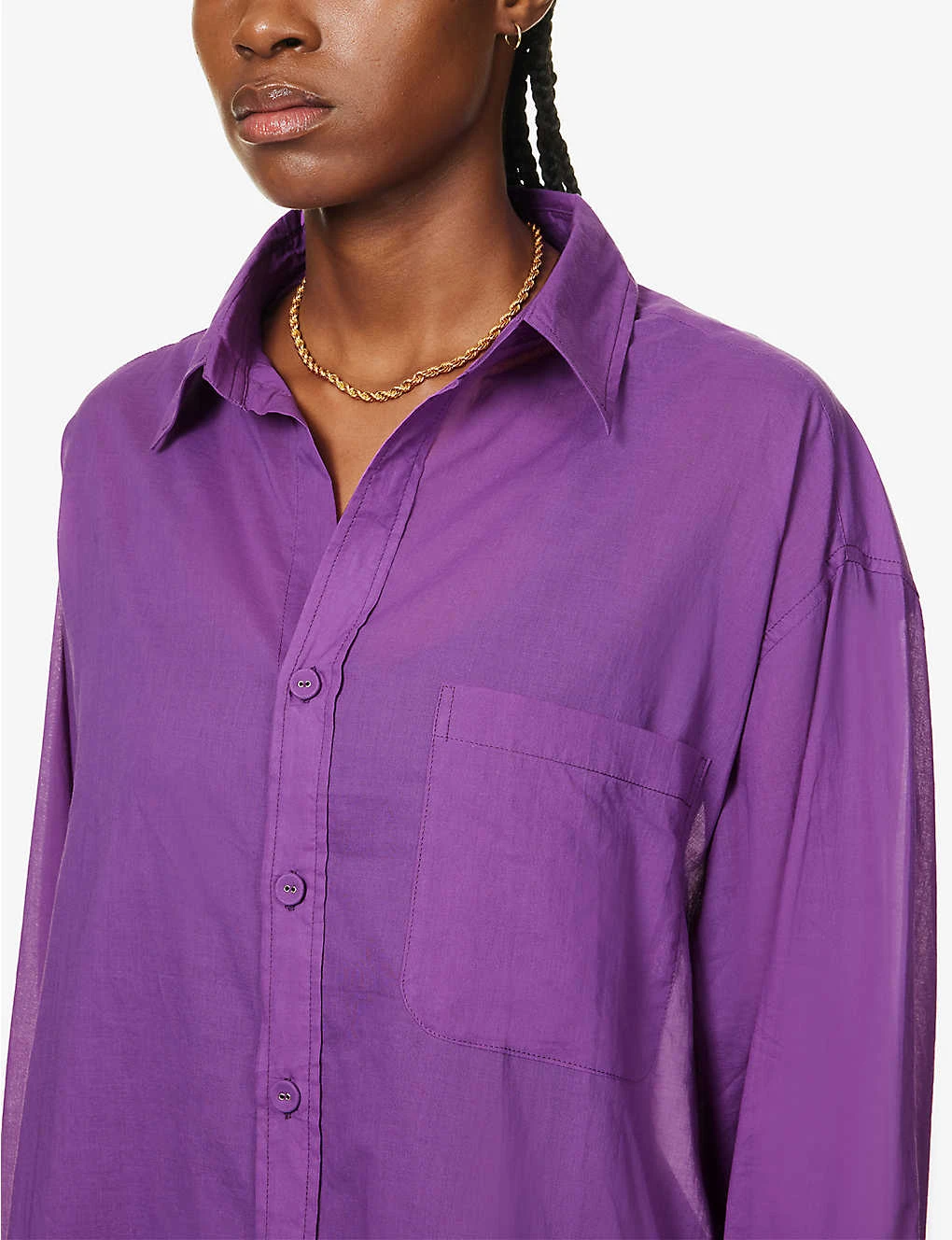 - Relaxed fit, collar, long sleeves, buttoned cuffs, patch pocket at front, all over sheer, curved hem