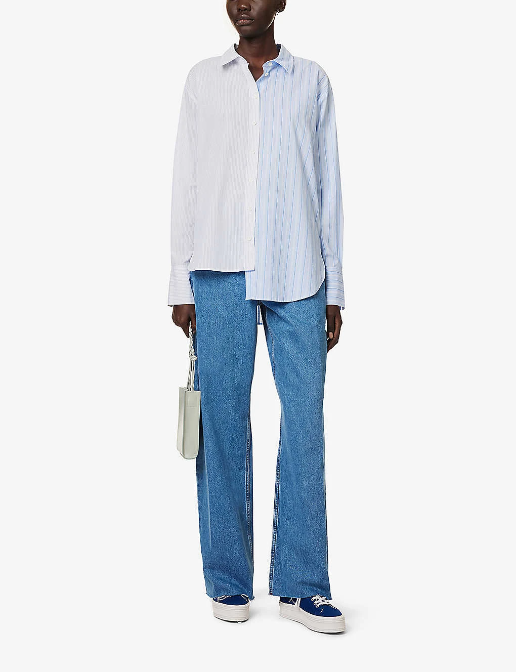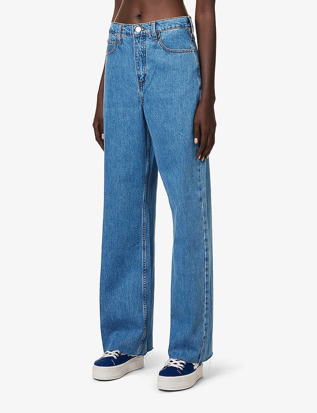 - Regular fit, high rise, wide leg, structured waistband with belt loops, five pockets, curved yoke at back, mid-wash, contrast stitching, branded silver-toned hardware, raw hems
