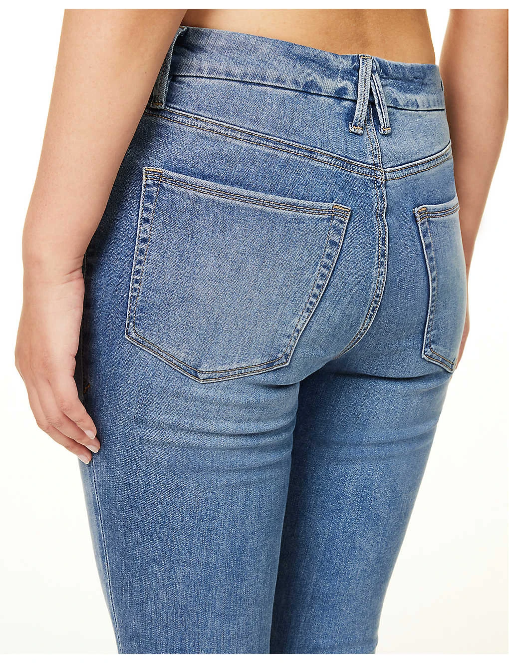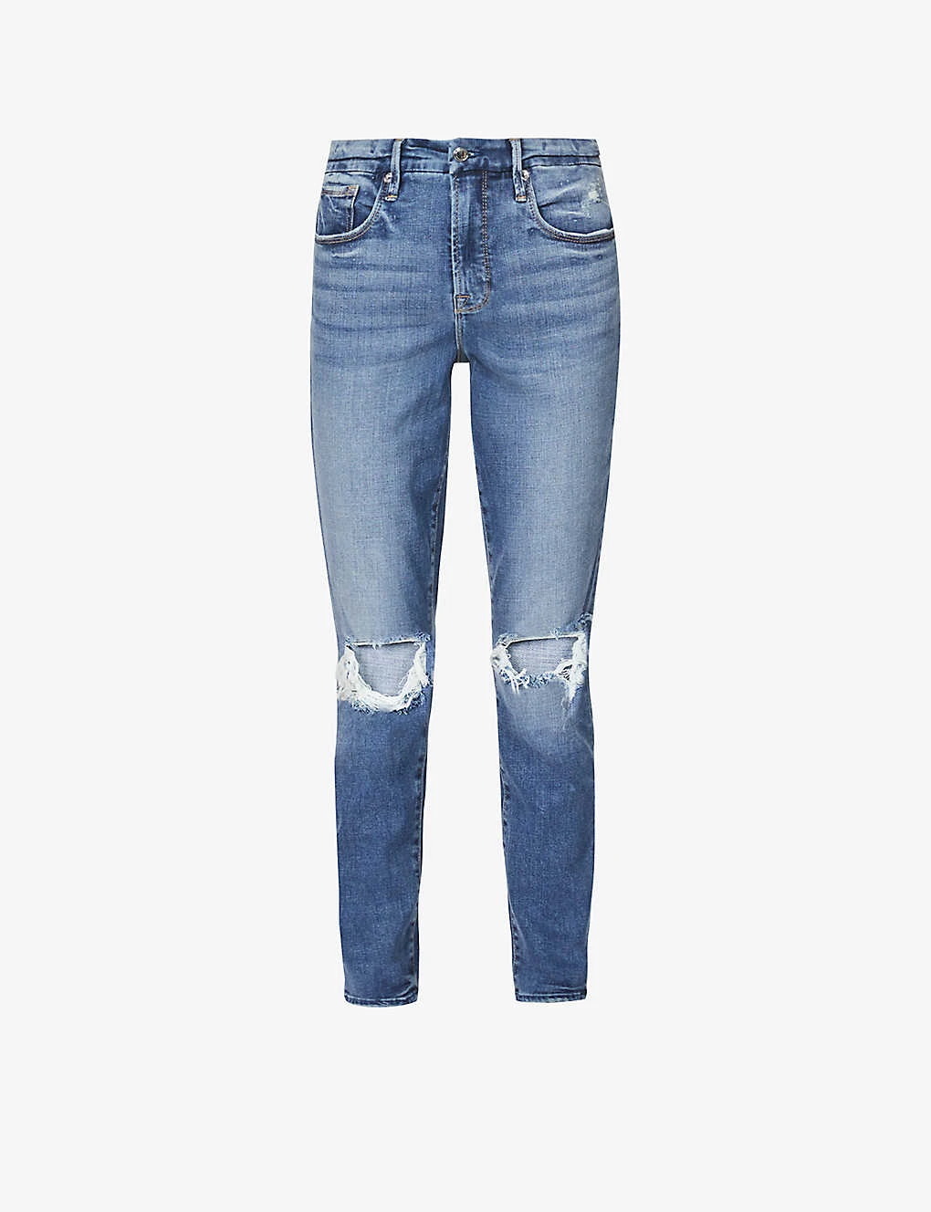 - Slim fit, high rise, skinny, belt loops, five pockets, branded hardware, faded wash and whiskering, ripped, V-shaped yoke at back