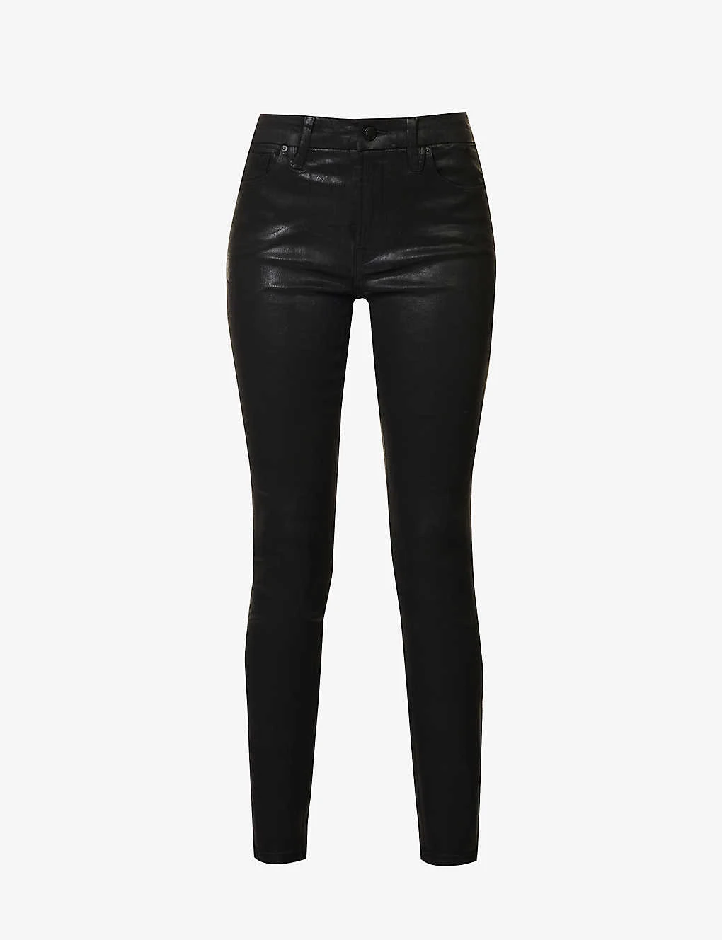 - Slim fit, mid-rise, tapered leg, belt loops, five pockets, coated texture, partially lined