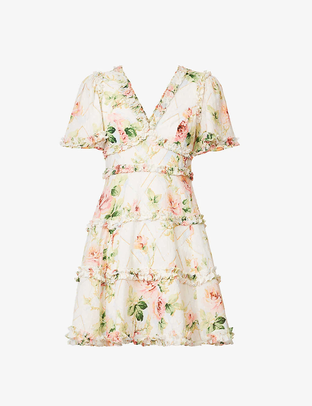 - Regular fit, deep V-neckline, short flutter sleeves, ruffle trims, all-over floral pattern, flared hem, lined
