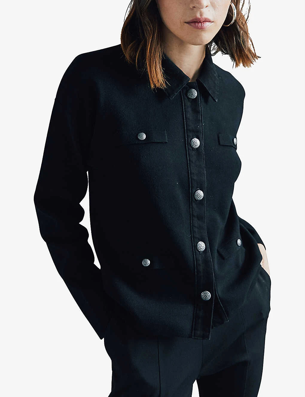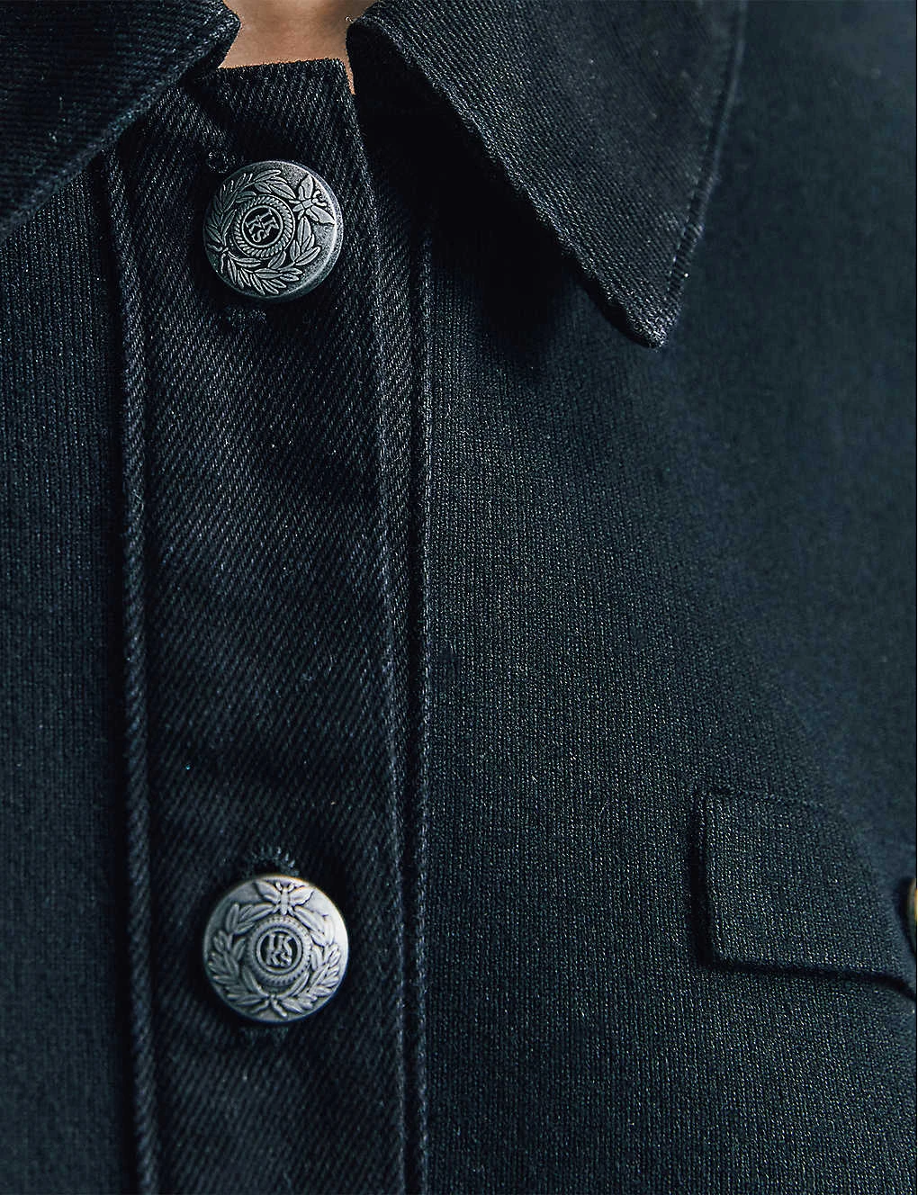 - Long sleeves, collar, silver-tone buttons, four patch pockets on front