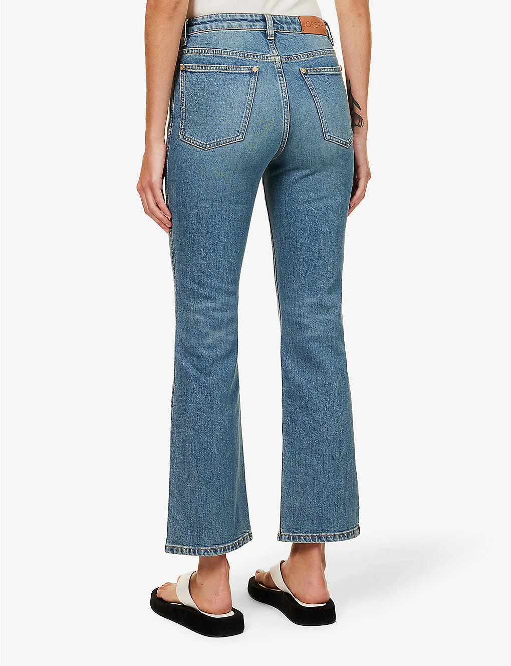 - Regular fit, mid-rise, flared leg, cropped length, belt loops, five pockets, contrast stitching, V-shaped yoke at back, brand patch at back, gold-toned hardware
