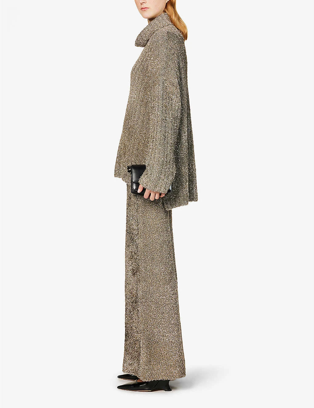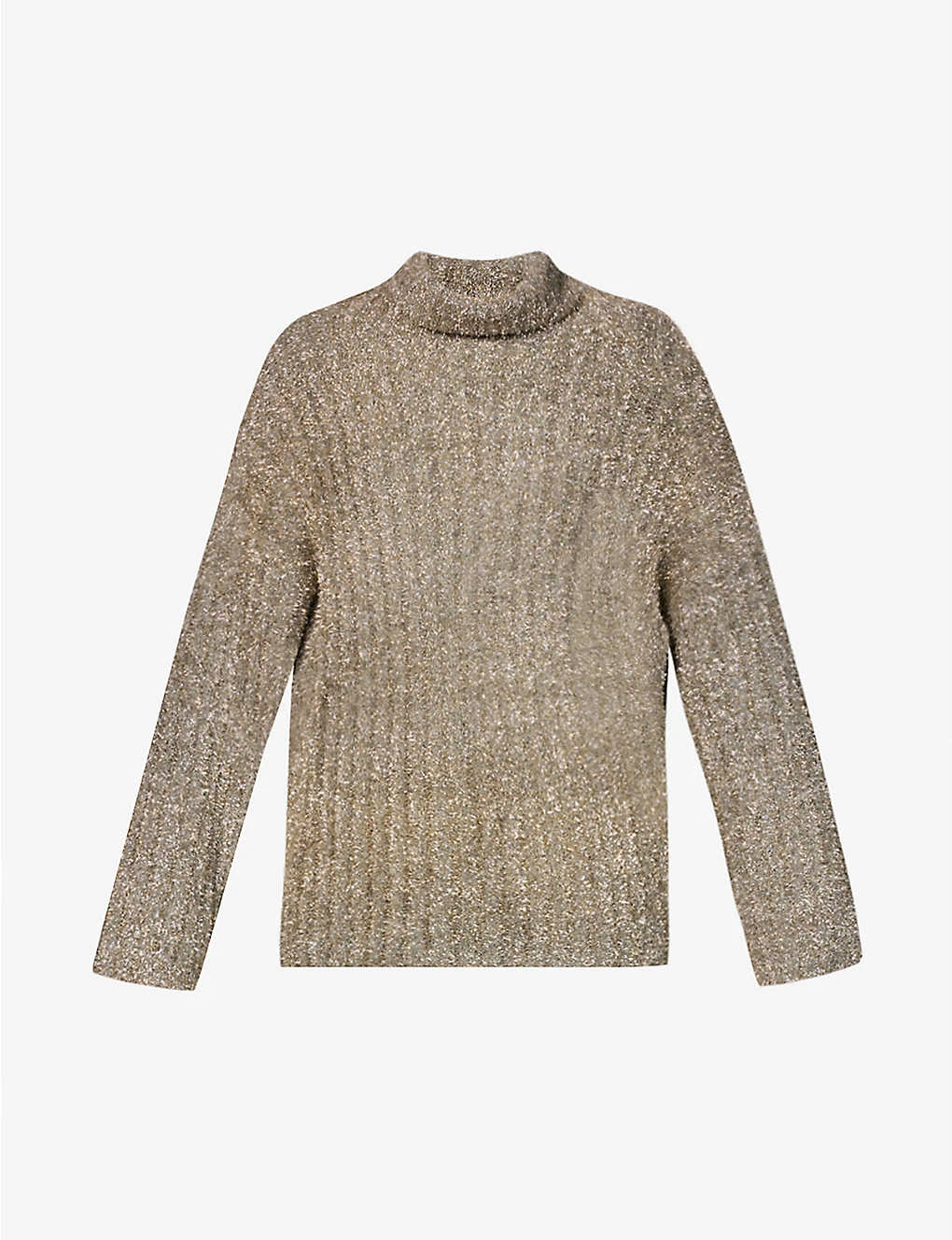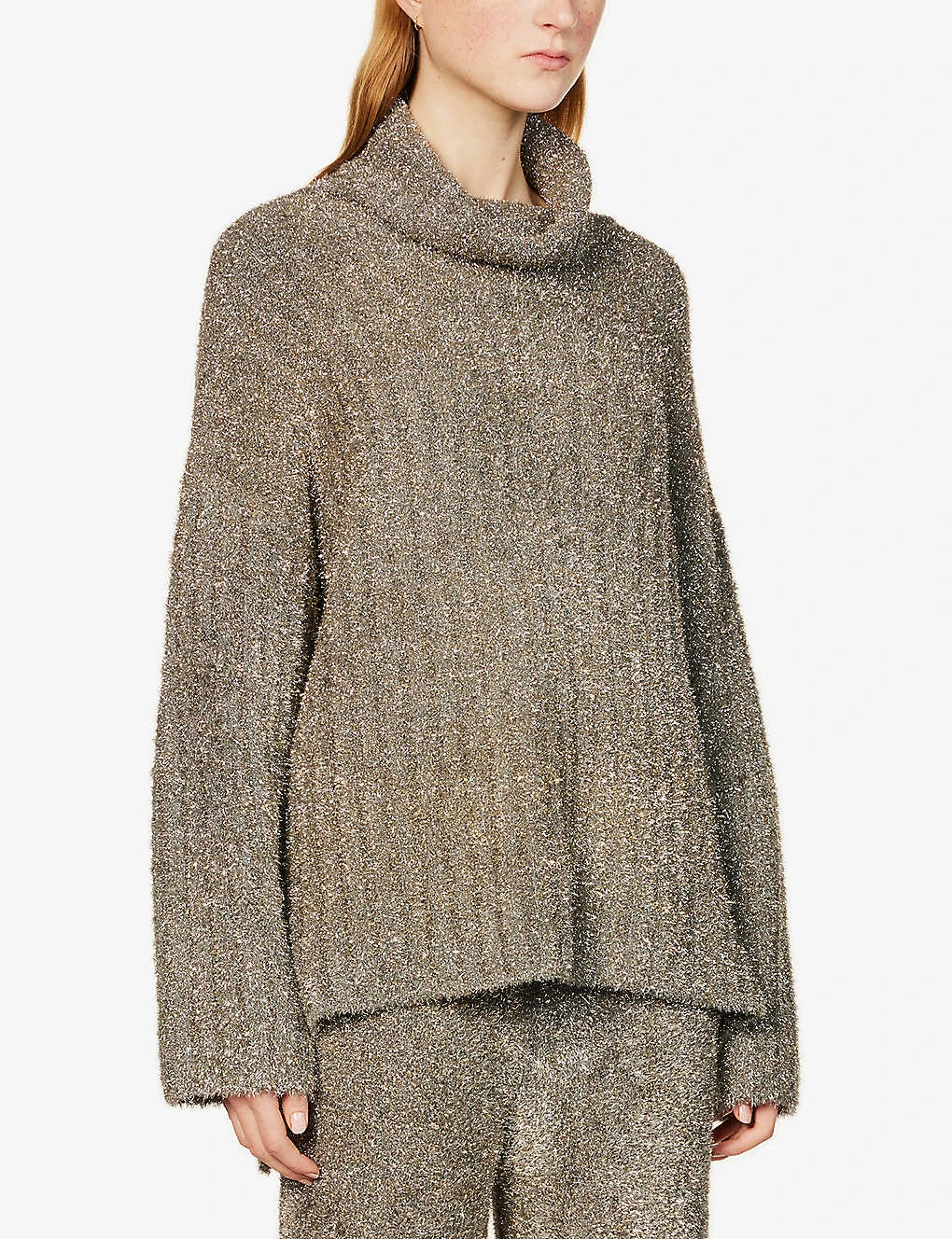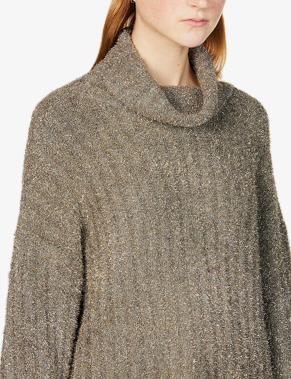 - Relaxed fit, turtleneck, dropped shoulders, long sleeves, all-over metallic knit texture