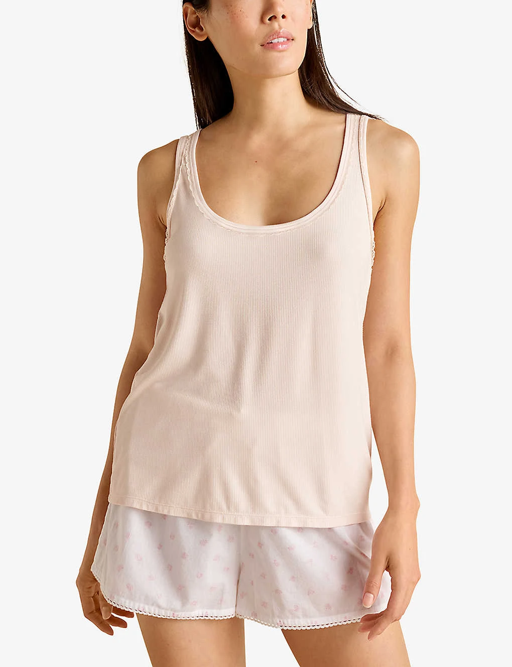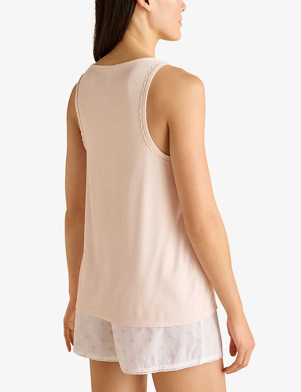 - Relaxed-fit, round neck, sleeveless, lace trim at front, all-over ribbed texture