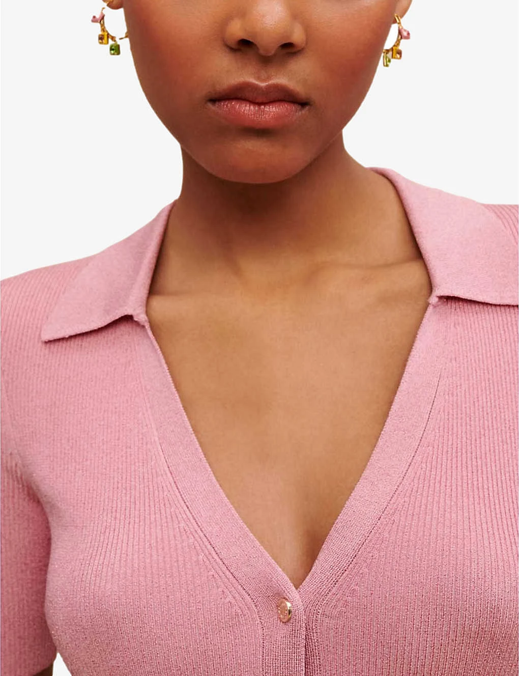 - Slim fit, V-neck, pointed collar, short sleeves, all-over ribbed knit, all-over metallic fibres