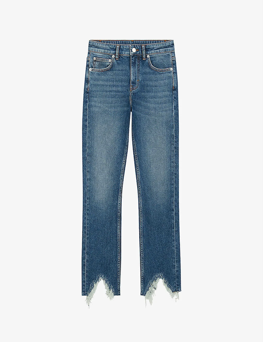 - Mid-rise, straight leg, distressed detail at hem, faded wash, two slip pockets at front, coin pocket, two patch pockets at back, slim fit