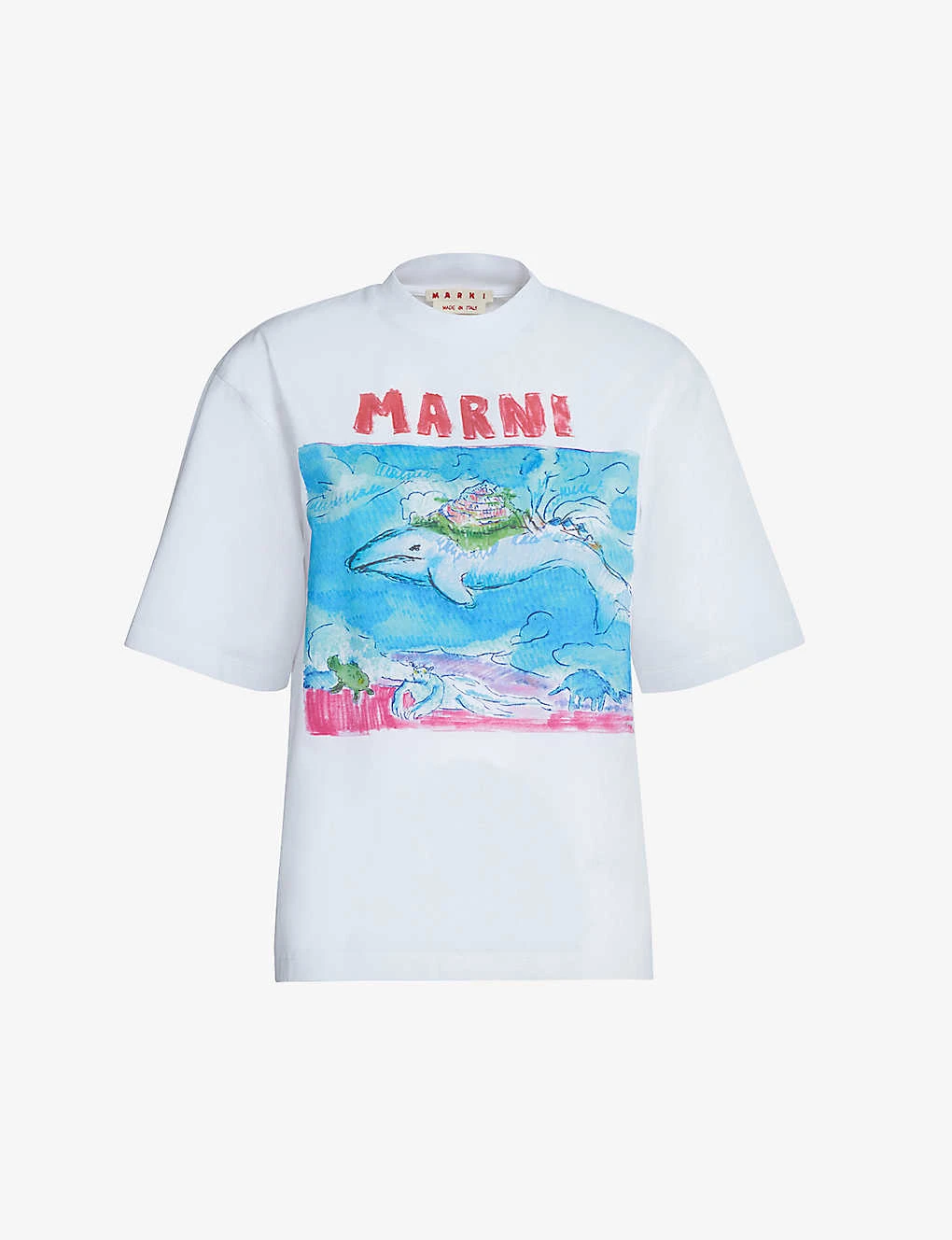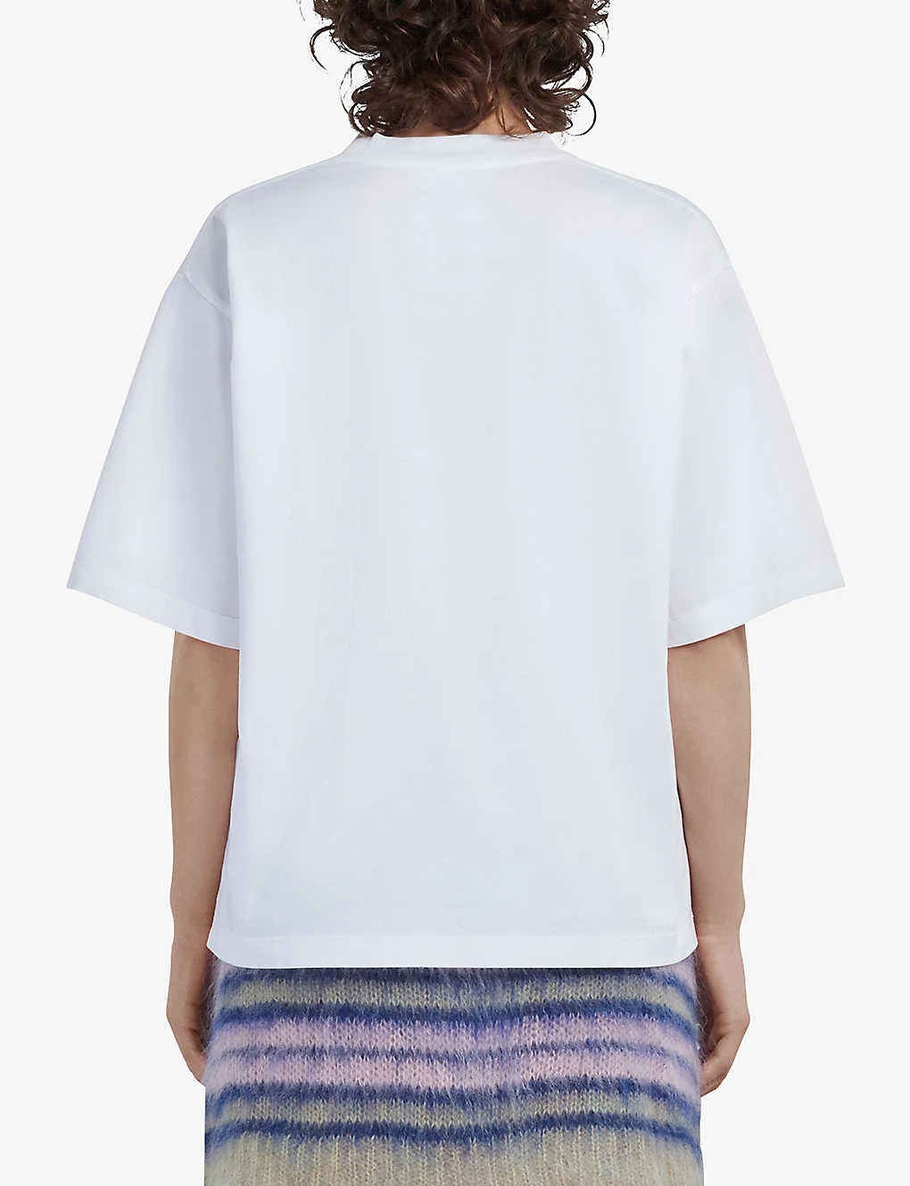 Boxy fit, crewneck, ribbed trim at neck, dropped shoulders, short sleeves, graphic brand print at front