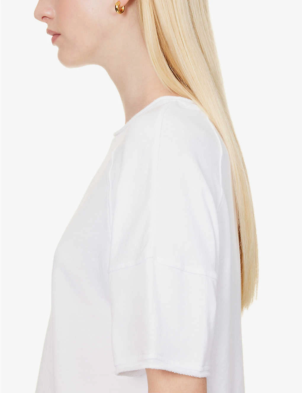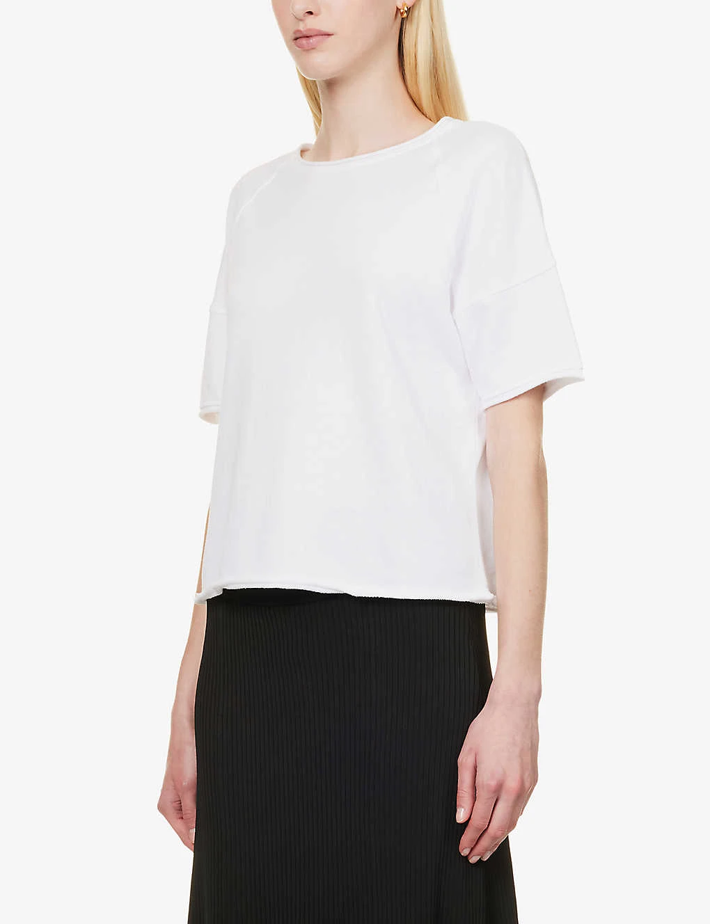 - Relaxed fit, round neck, dropped shoulders, short sleeves, raw rolled trims