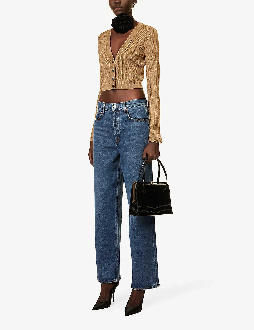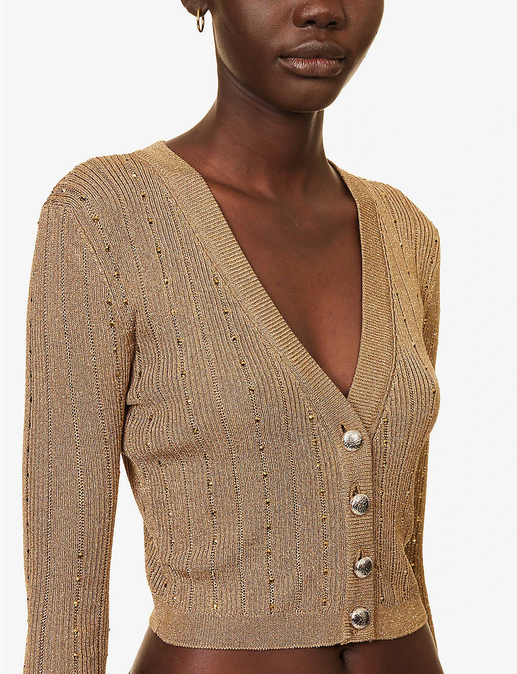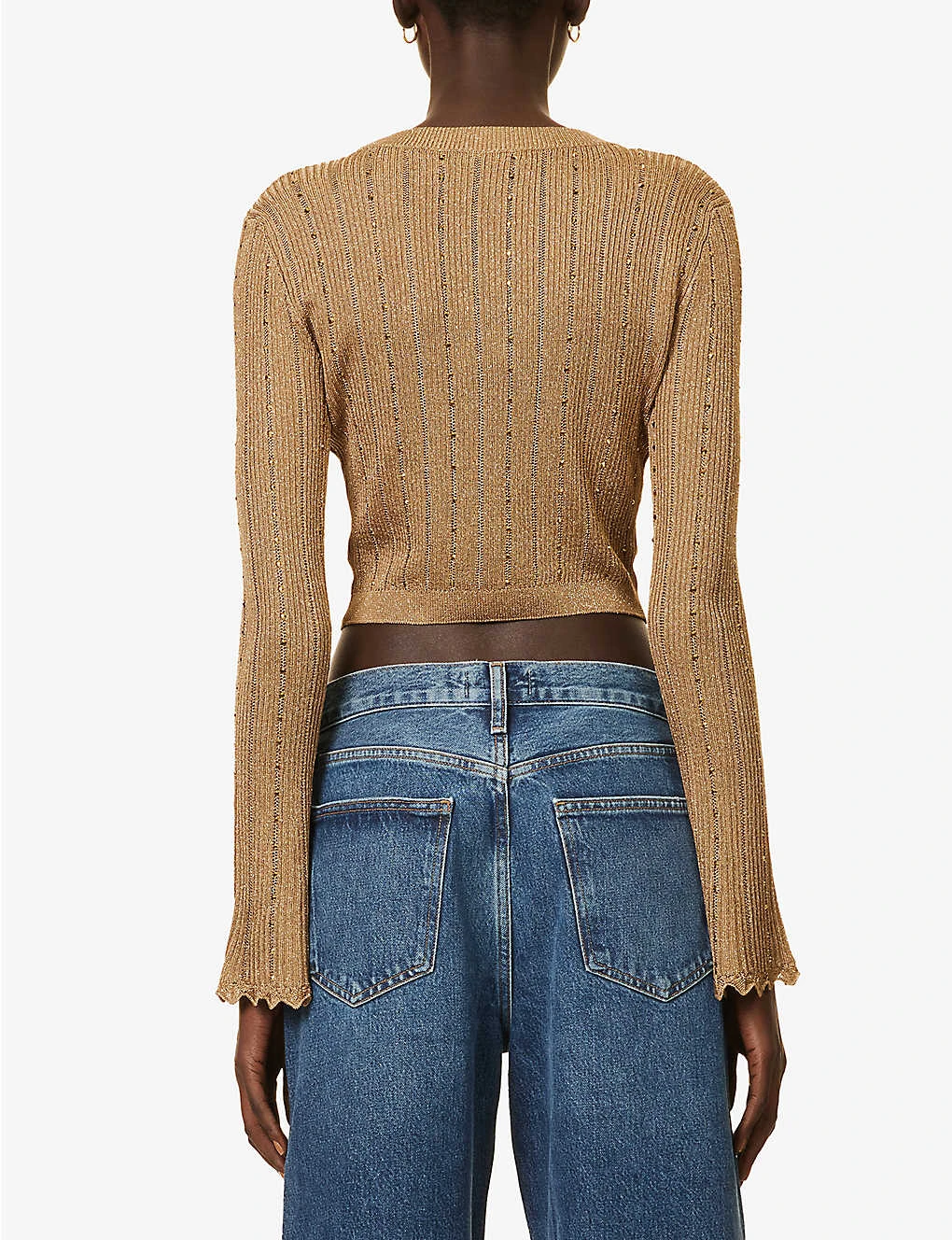 - Slim fit, cropped, ribbed V neck, long sleeves, flared scalloped cuffs, all over ribbed and knitted, metallic weave, all over crystal embellishment, ribbed elasticated hem