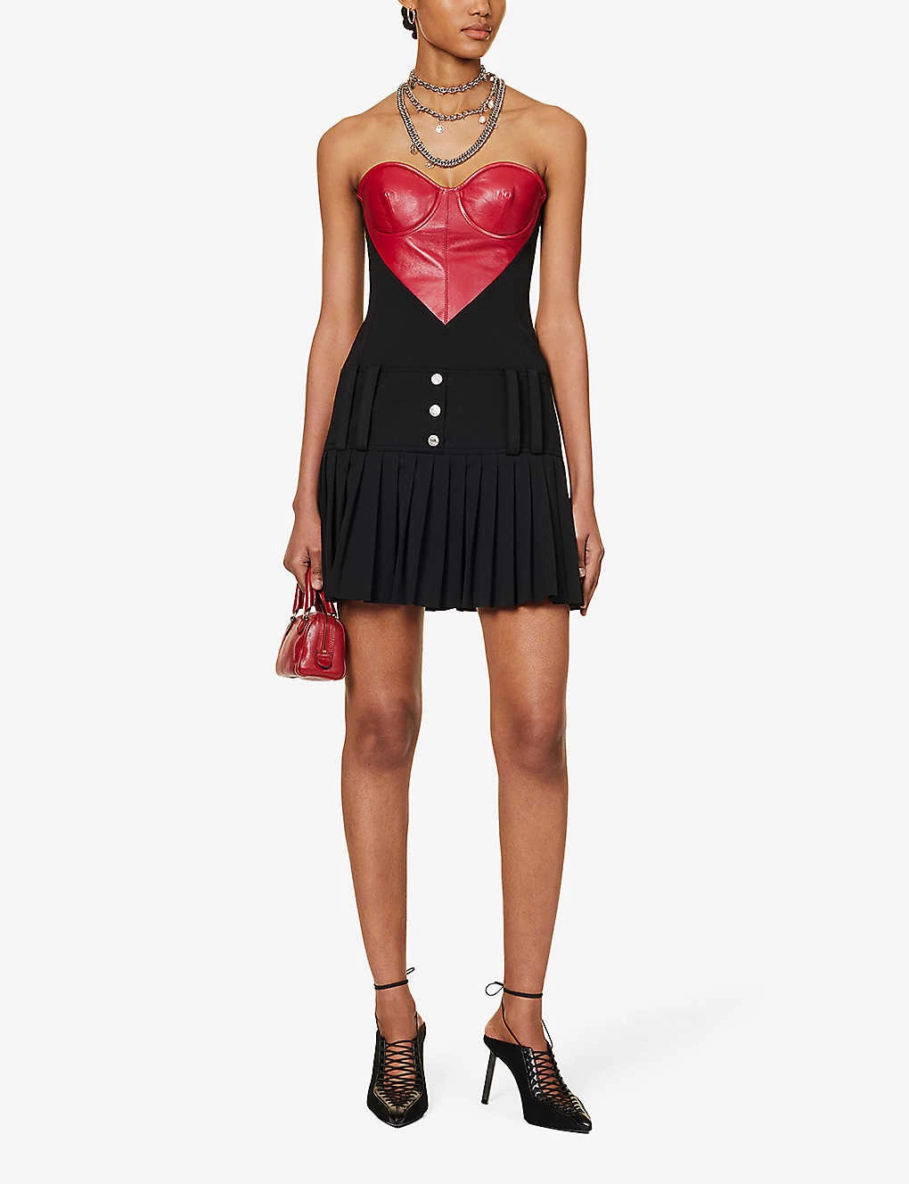 - Slim fit, sweetheart neckline, strapless, underwired cups, contrast heart panel at front, wide belt loops, silver-toned buttons at front, box-pleat hem, lined