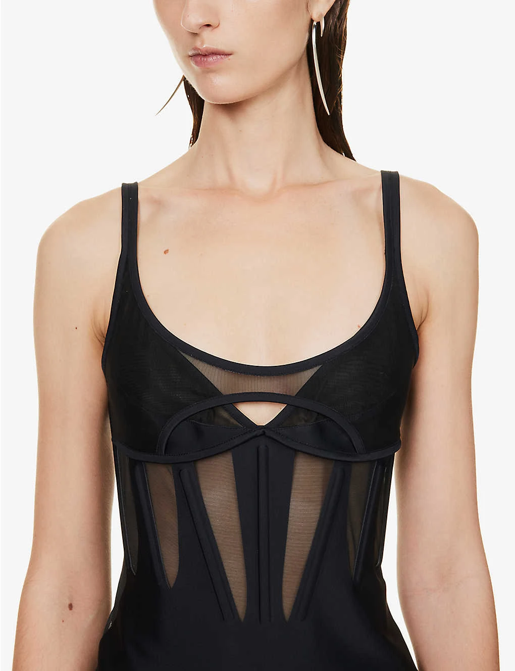 - Slim fit, scoop neckline, sleeveless, adjustable straps, corset bodice, sheer panels