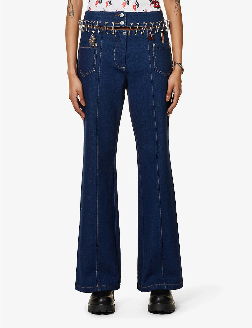 - Regular-fit, high-rise, wide leg, carabiner chain at waist, branded silver-toned hardware, hanging branded metallic plaque at front, beaded Seahorse and Cherry charm at front, two patch pockets at front and back, contrast stitching, exposed seams, partially lined