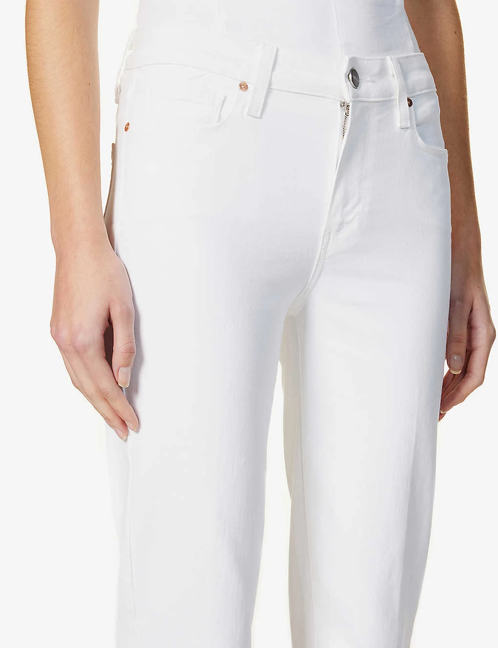 - Slim fit, high rise, bootcut leg, structured waistband, belt loops, five pockets, V-shaped yoke at back, brand patch at back, tonal stitching, branded silver-toned hardware