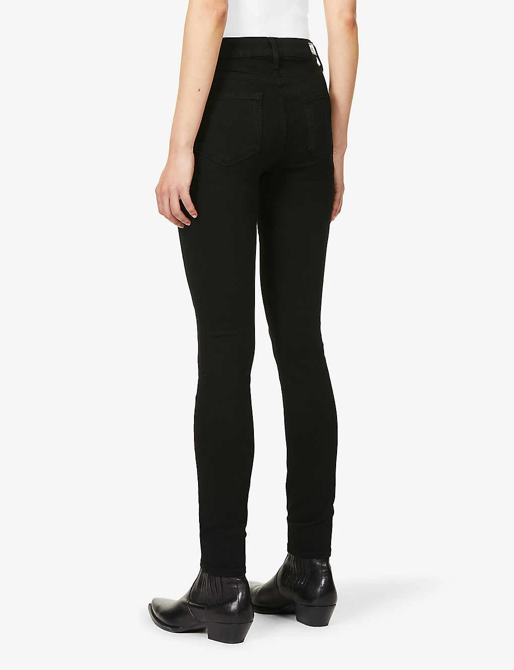 - Skinny, mid-rise, belt loops, five pockets, branded hardware, all-over dark wash, stitched detail at back pocket, brand leather patch at back waistband, v-shaped yoke at back