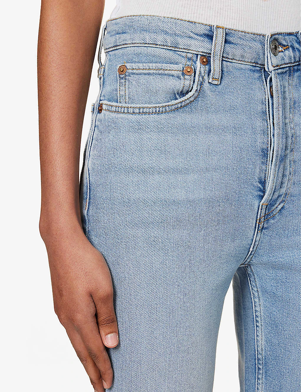 - Slim fit, high rise, cropped slim leg, structured waistband with belt loops, five pockets, brand patch at back, curved yoke at back, faded wash, contrast stitching, branded hardware