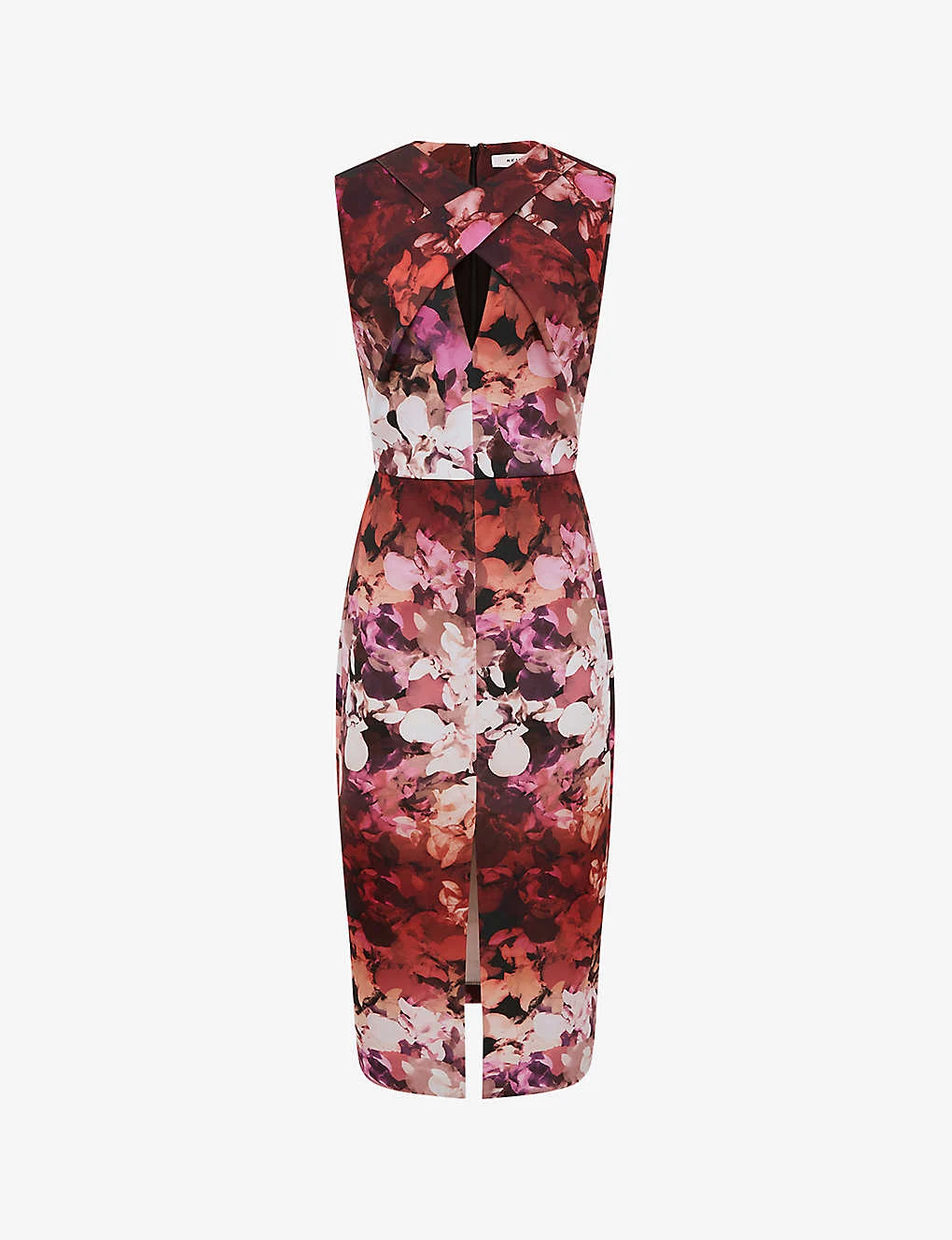- Round neck, cross-over detail, sleeveless, all-over floral print, cut-out at front, high-waist, midi skirt, split at front hem, lined