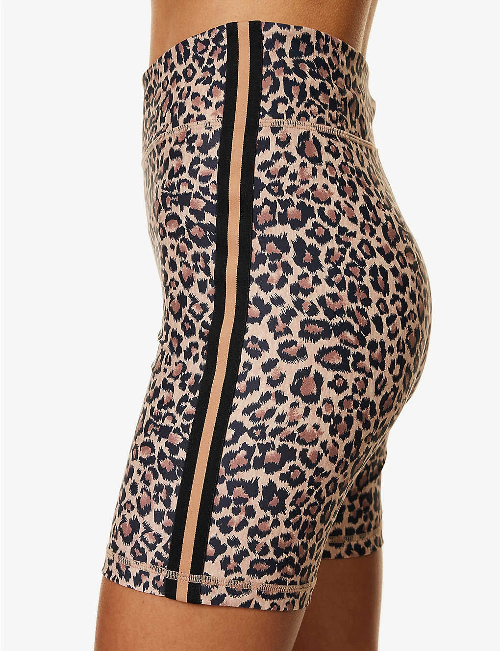 - Slim fit, high-rise, elasticated waistband, striped panel at sides, all over leopard print