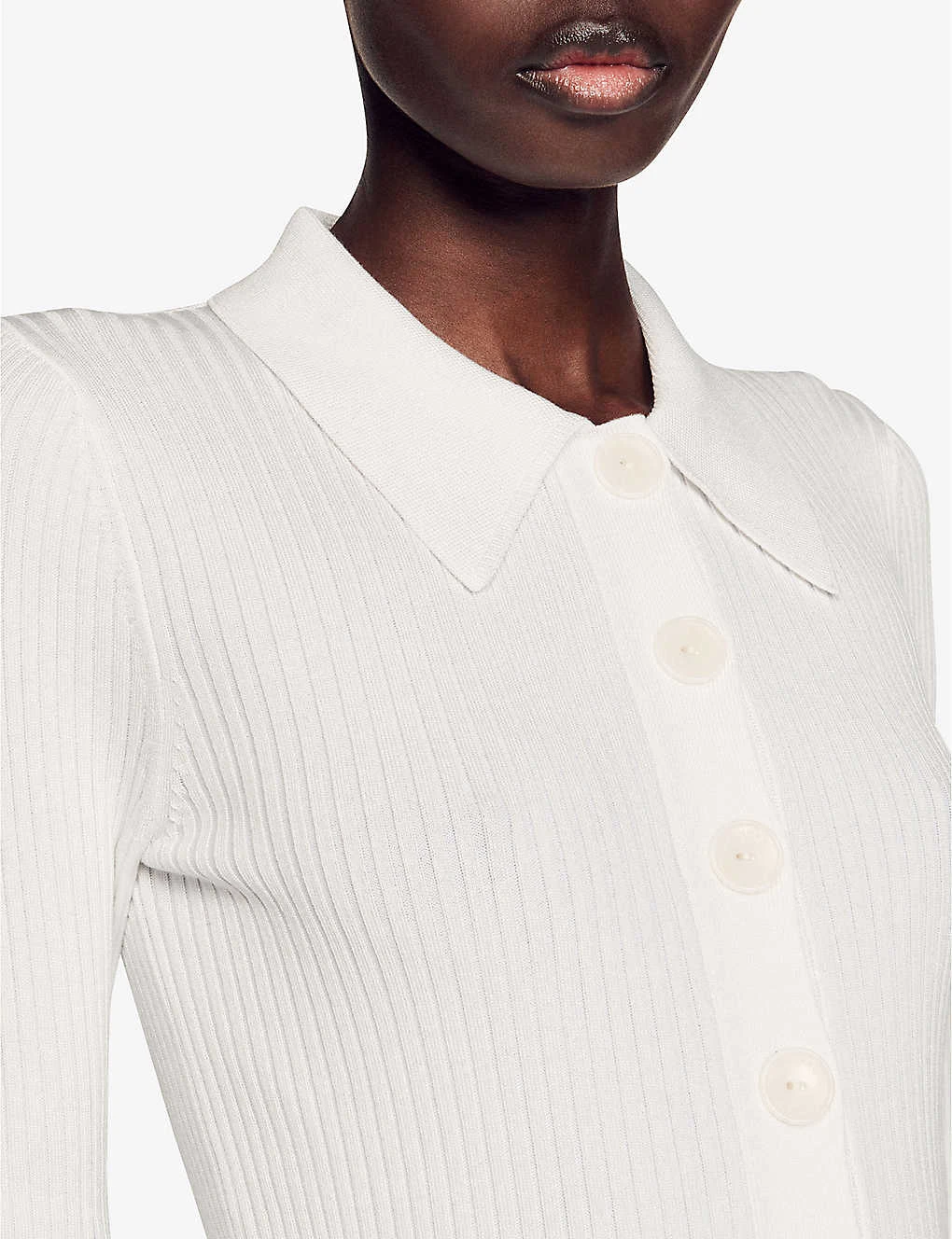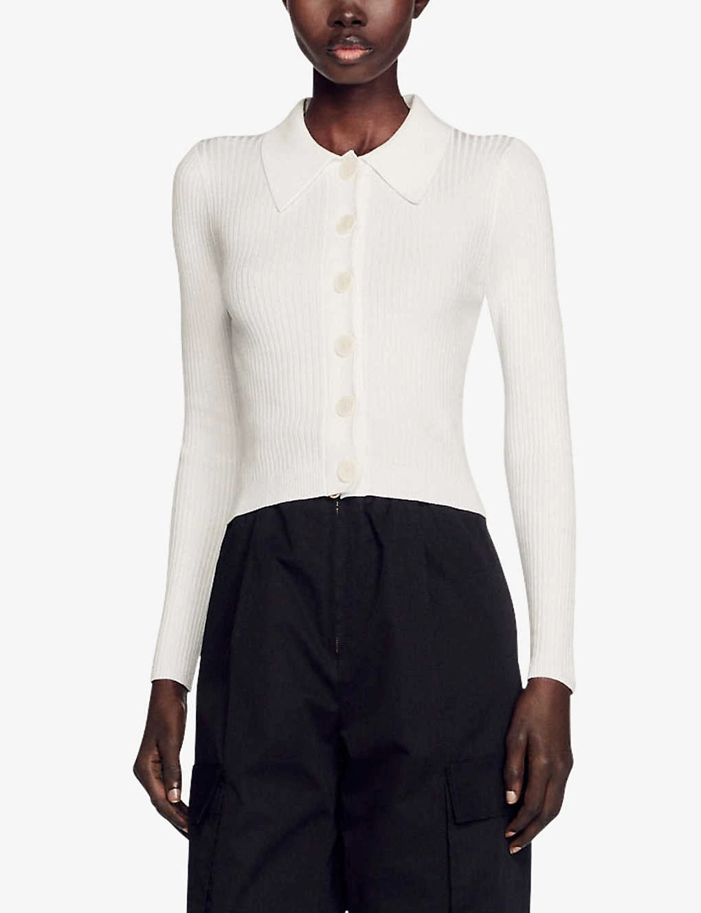 - Slim fit, long sleeves, pointed collar, ribbed knit, cropped length, straight hem