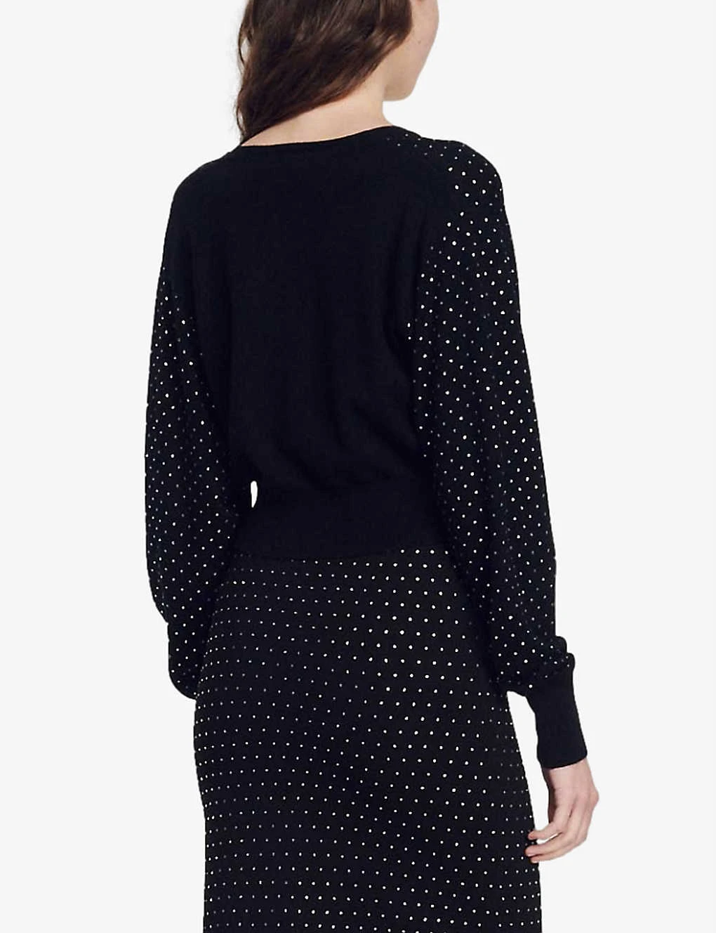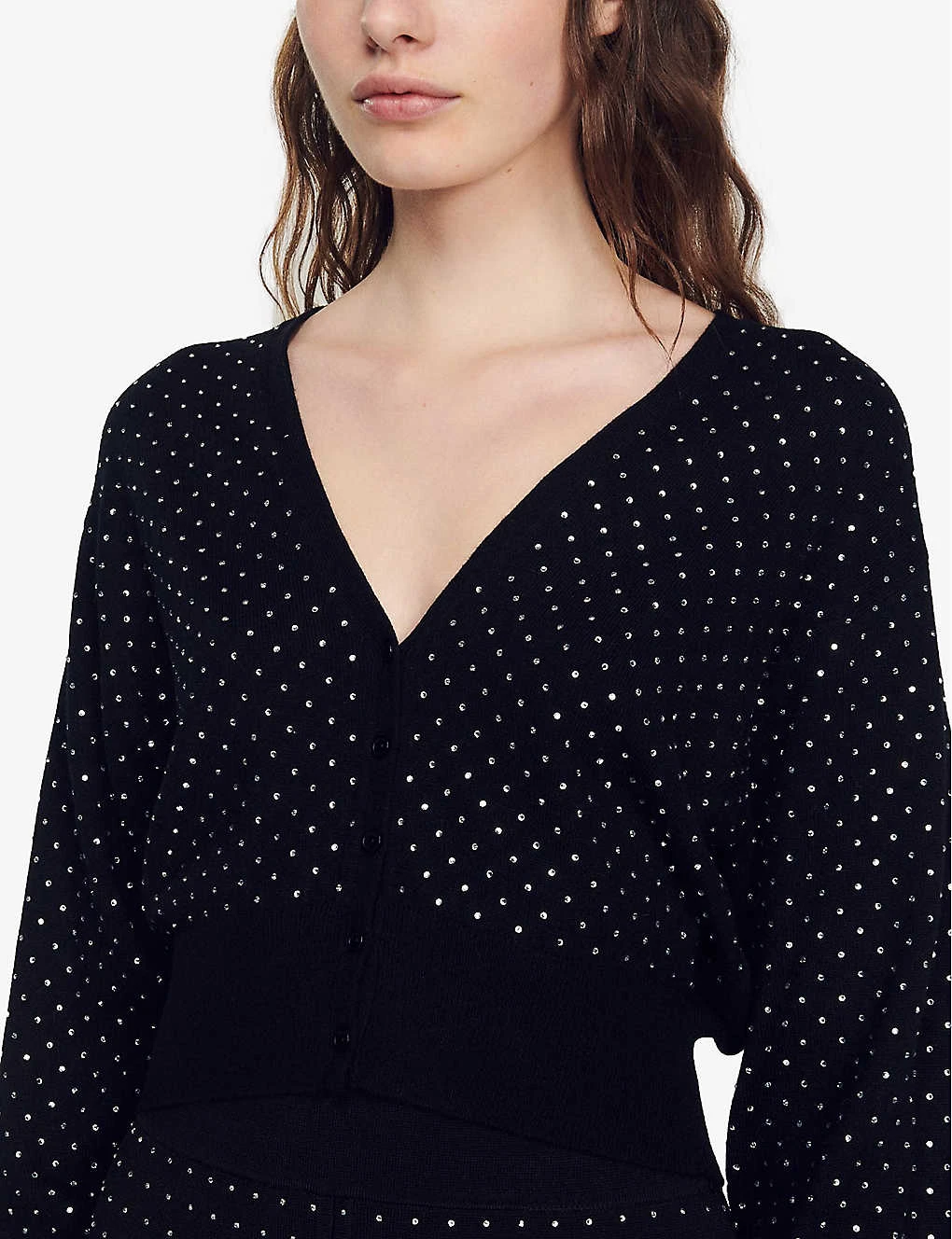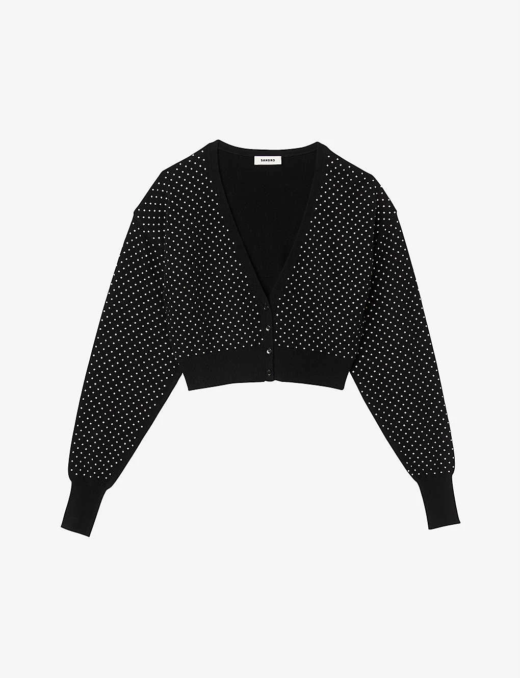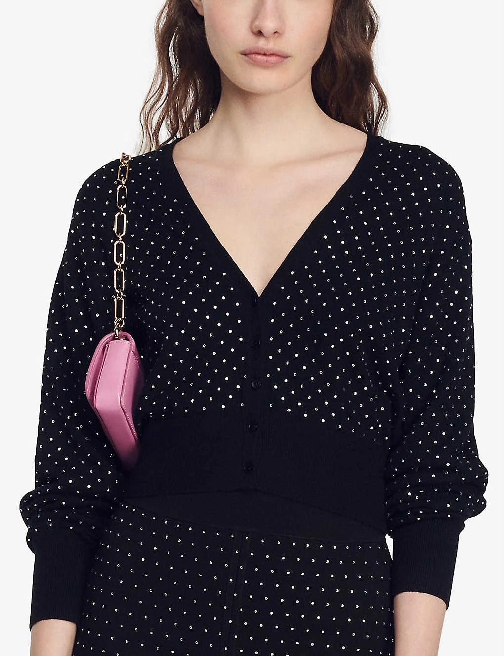 - V-neck, long sleeves, ribbed hem and cuffs, tonal buttons, all-over rhinestone embellishment, cropped length