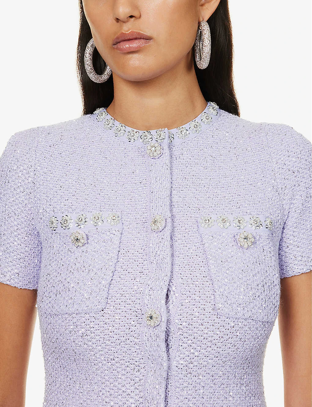 - Slim fit, round neckline, short sleeves, four patch pockets at front, medium knit texture, embellished buttons and trims, bouclé texture with sequin embellishment