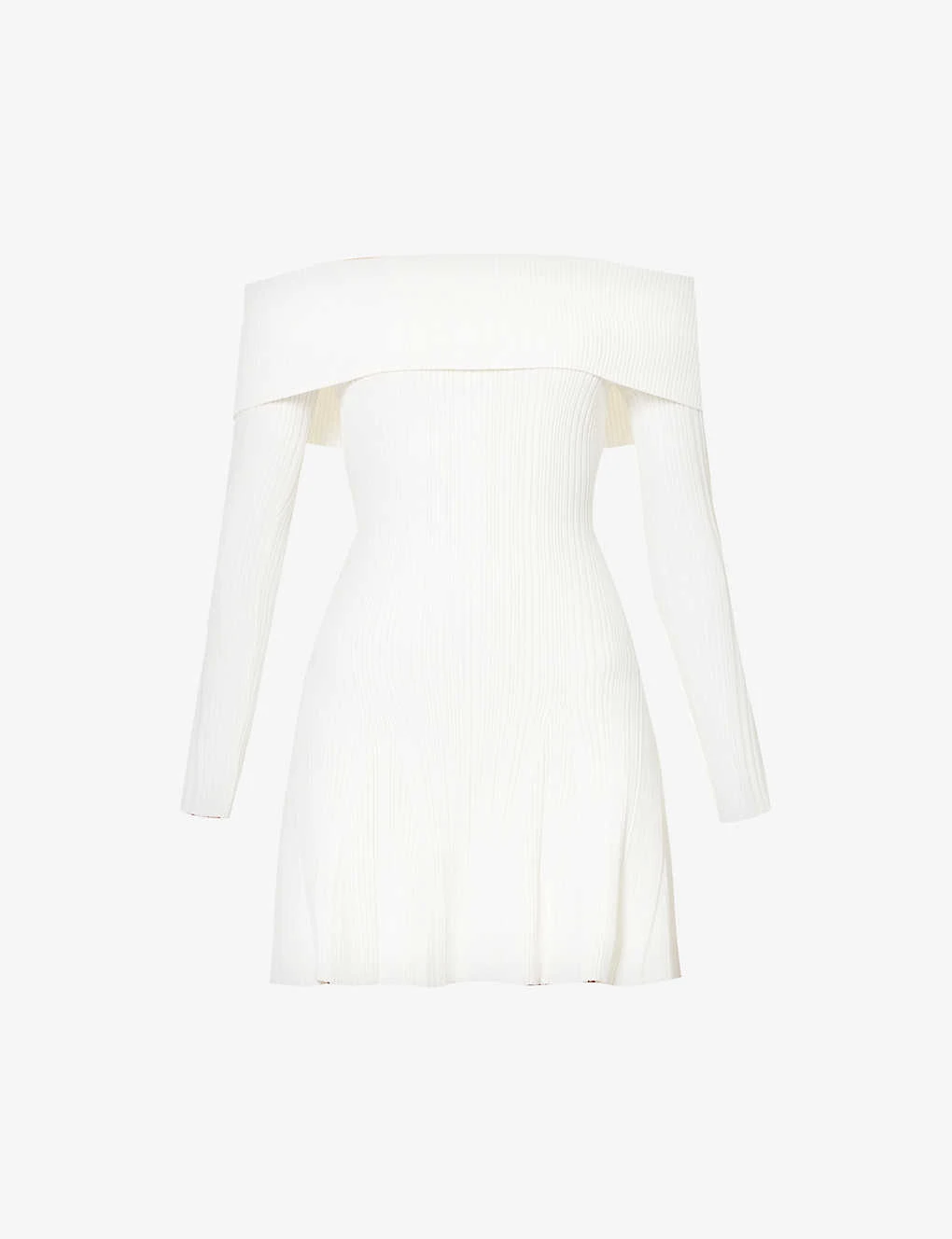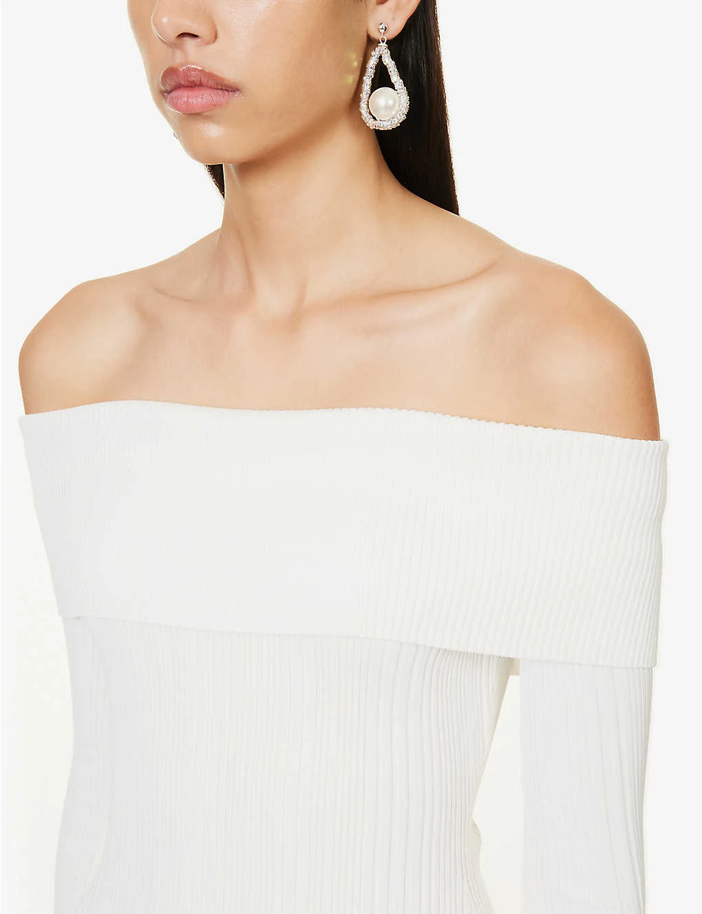 - Slim fit, bardot neckline, exposed shoulders, folded overlay at shoulders, long sleeves, ribbed fine knit texture, flared hem