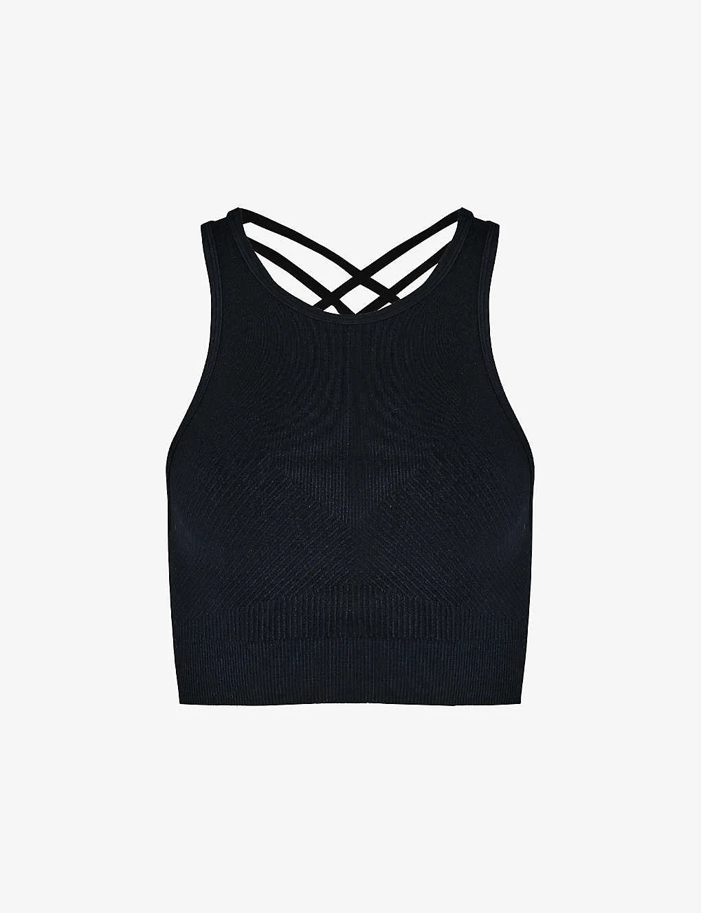 - Light support, seamless design, high-neck, removable cup padding, strappy racerback, supportive underband, logo print at back