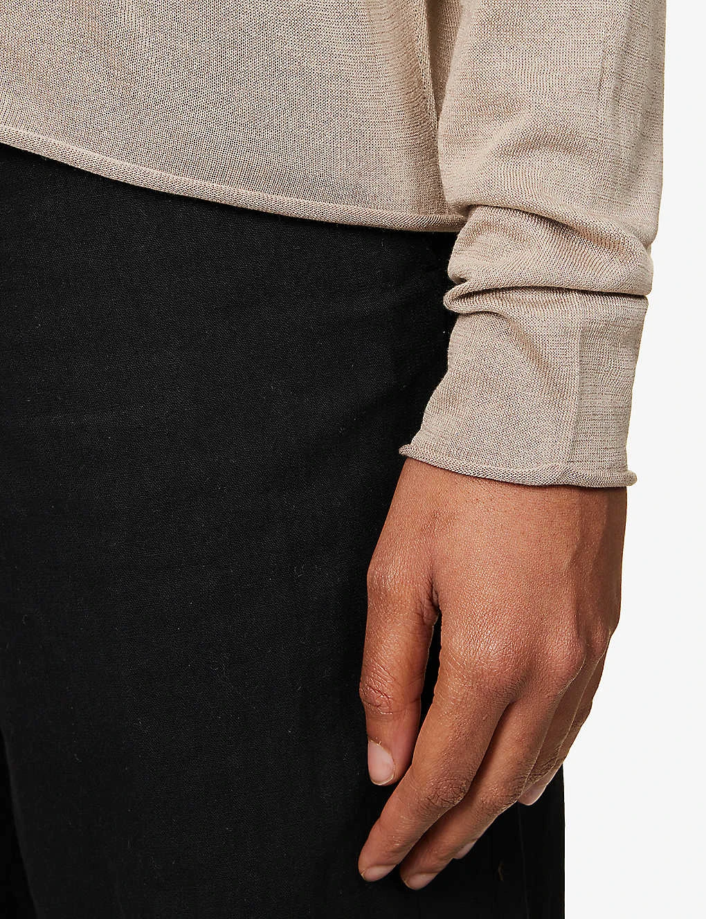 - Relaxed fit, scoop neckline, long sleeves, fine knit texture, rolled raw trims
