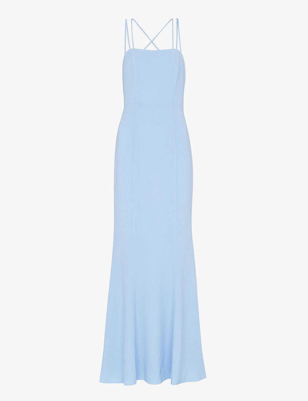 - Slim fit, maxi length, flared skirt, square neckline, double spaghetti straps, low-cut back, crossed straps at back, sleeveless