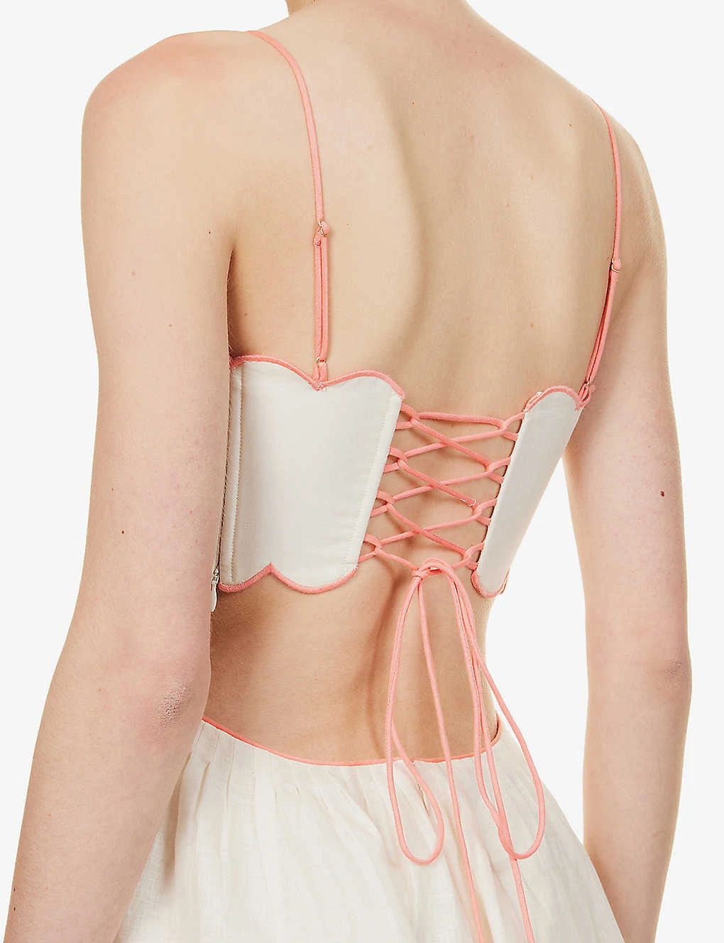 - Regular fit, square neckline, sleeveless, self-tie straps, two slip pockets at front, open back, floral pattern, scallop trims, flared hem